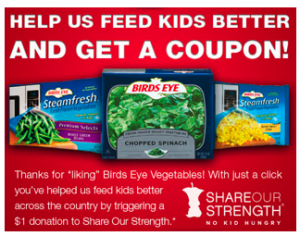Birds Eye will also donate $1 per person who likes their page to Share Our Strength — an organization dedicated to fighting hunger.