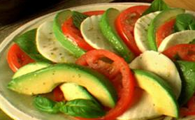 | Ingredients: 2 medium red, ripe tomatoes, cut into eight slices 1 bunch fresh basil, leaves removed, washed and patted dry with a paper towel 8 oz. fresh mozzarella, cut into eight slices 1 ripe avocado from Mexico, pitted, peeled and sliced 2 teaspoons extra virgin olive oil 1/8 teaspoon freshly cracked black pepper (optional) 1/8 teaspoon sea salt (optional) |