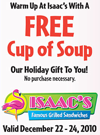 Print this coupon for a FREE cup of Soup at Isaac’s. Good only 12/22 to 12/24.
