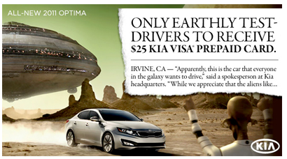Test-drive the all-new 2011 Kia Optima between February 3, 2011, and March 31, 2011, and receive a thank you with a $25 prepaid card.