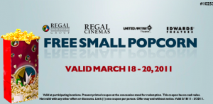 There is a new free popcorn coupon for Regal Cinemas this weekend. No purchase necessary. The coupon is valid 3/18-3/20.
