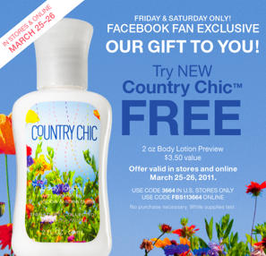 Use this Bath & Body Works Coupon to get a free 2 oz Country Chic Lotion at Bath & Body Works on 3/25 (Fri) and 3/26 (Sat).