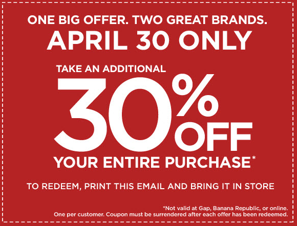 If you are heading to Tanger Outlets this weekend, take along this 30% off Gap Outlet or Banana Republic Factory Store coupon!