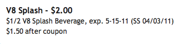 However if you are a couponer, you’ll notice that you can get better deals on cereal and even some juices with coupons at your grocery store that doubles coupons. For instance, V8 Splash sells for .