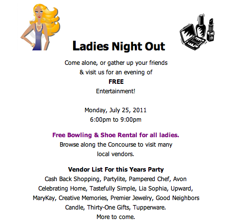 Just a reminder that Ladies Night Out with FREE bowling, games, door prizes, and snacks at Dutch Lanes is next Monday, July 25 from 6pm to 9pm!
