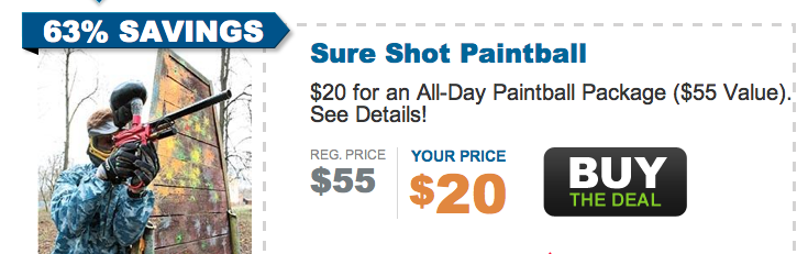 Are you looking for a great idea for a bachelor party or a birthday surprise for a guy? Or even a crazy date with your significant other? My husband loves paintball, and thought I definitely needed to post this deal on my blog! 😉
