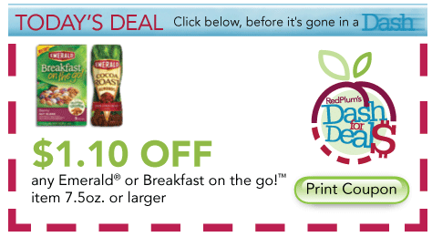 Today’s RedPlum Dash for Deals is $1.10 off Emerald Nuts. (If you can’t see the dash deal, click on the Redplum logo in the upper left corner.)