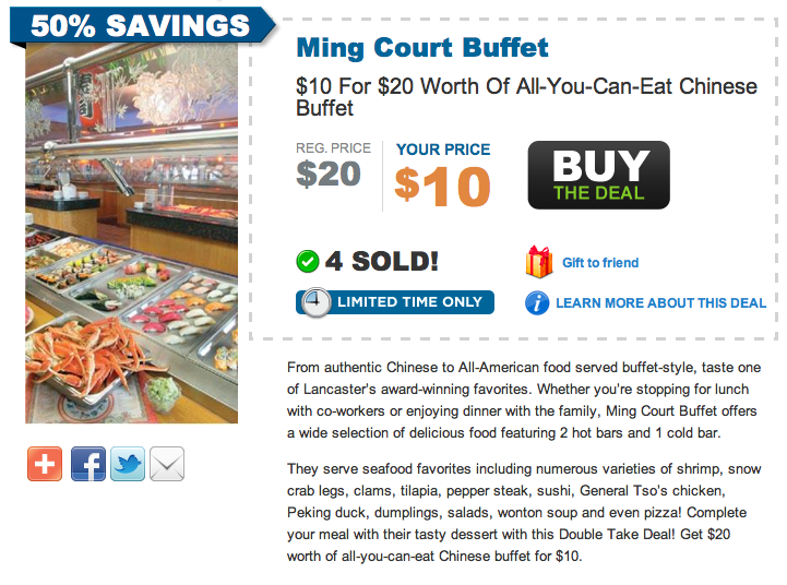 My husband is going to LOVE this new deal when he sees it! You can get $20 certificate to Ming Court Buffet (on Fruitville Pike) for only $10.