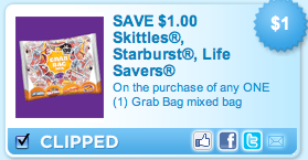 Use zip code 90210 (if needed) at coupons.com to print a$1/1 any Grab Bag mixed bag of Skittles, Starburst, Life Savers coupon!