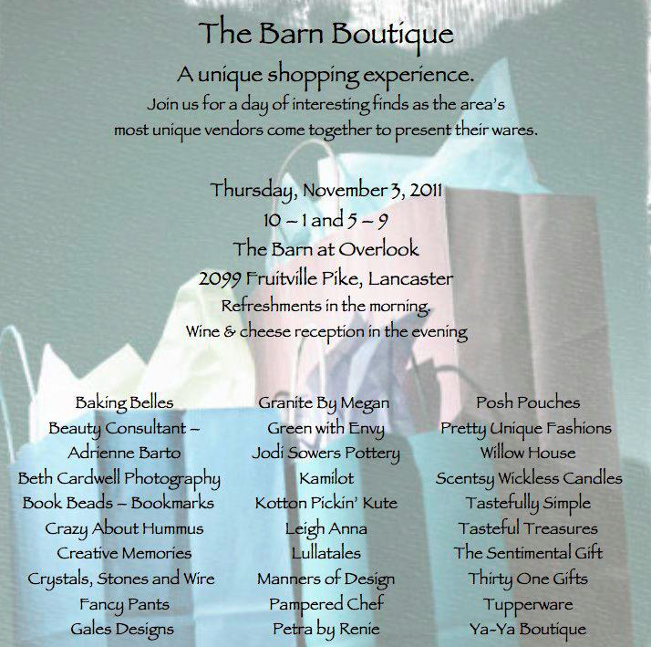 This Thursday is the 2011 Barn Boutique at the Barn at Overlook, 2099 Fruitville Pike, Lancaster.