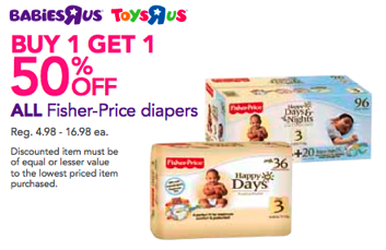 * All Fisher-Price diapers buy one get one 50% off