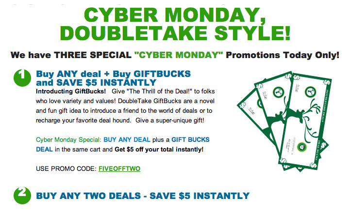 You can use the code FIVEOFFTWO on DoubleTake Deals today to get $5 off instantly when you buy any two deals or any deal plus giftbucks!