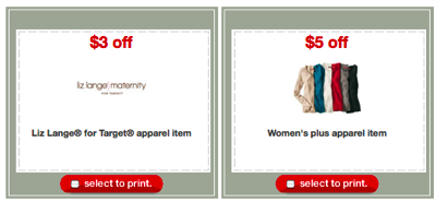 Print a $3/1 Liz Lange coupon and a $5/1 Women’s Plus Apparel coupon.