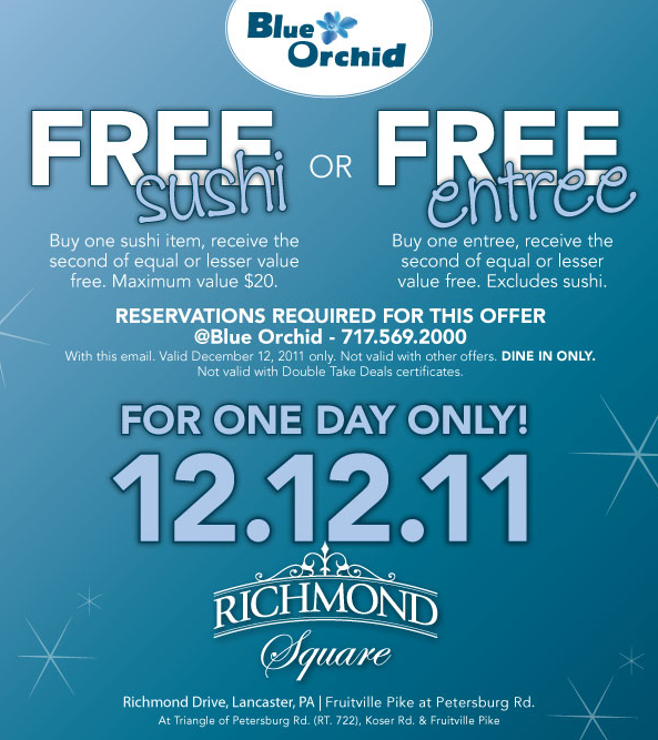 You can get FREE sushi or a FREE entree tomorrow at the Blue Orchid!