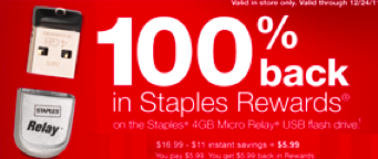Staples is offering a FREE Staples 4GB Micro Relay USB Flash Drive after Staples Rewards. Offer is valid in stores only. through 12/24/11.