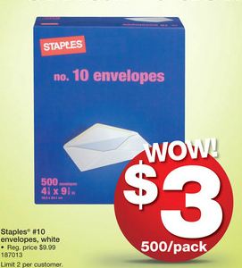 This week, I found 500 #10 white envelopes at Staples for only $3! Regularly priced at $9.99. Please note there is a limit of two per customer.