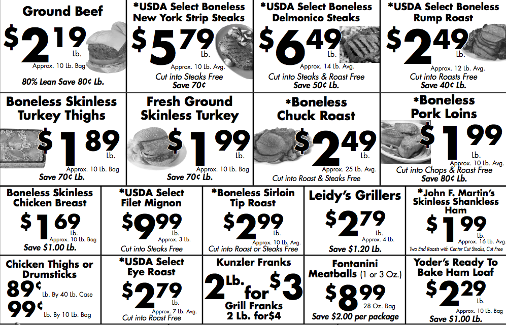 Yoder’s 3 Day Meat Sale is this week! There are some good prices including $2.19/lb ground beef, $2.49/lb chuck roast (not bad, but I did get some for $1.89/lb a couple of weeks ago), $.99/lb chicken drumsticks and $1.69 chicken breasts.