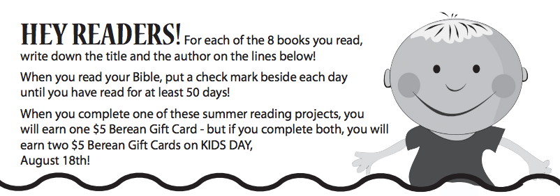 Just bring your completed reading form back to Berean on KID’S DAY August 18th and receive your reward!