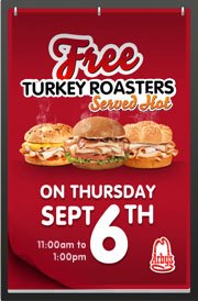 From 11am to 1pm this Thursday, September 6, you can get a FREE Turkey Roasters Sandwich at Arby’s. Choose from Turkey Classic, Turkey n’ Cheddar Classic or Grand Turkey Club.
