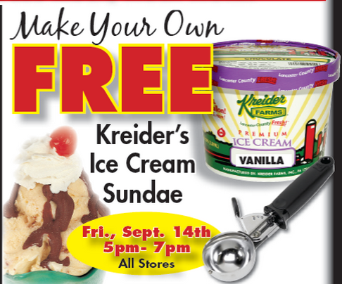 From 5pm-7pm tomorrow (Friday, September 14) you can get a FREE Kreider’s Ice Cream Sundae at all Darrenkamp’s store locations in Willow Valley, Mount Joy and Elizabethtown!!