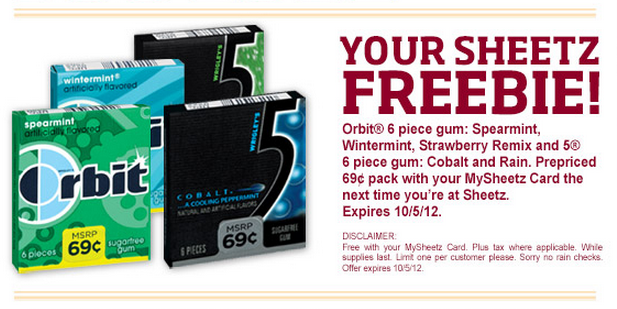 Use your MySheetz card to get a FREE Orbit or 5 six-piece gum. Expires October 5, 2012.