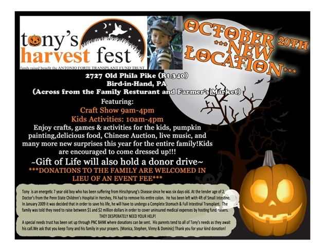 Enjoy games, activities, pumpkin painting, food, an auction, live music and more at TONY’S HARVEST FEST 2012 along Route 30 in Bird-In-Hand this Saturday, October 20 from 9am to 4pm.