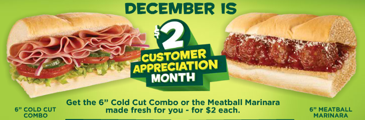Get the 6″ Cold Cut Combo or the Meatball Marinara Sub for only $2.00 at Subway in December.