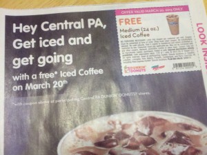 Did you see the coupon in yesterday’s paper for a FREE medium iced coffee from Dunkin Donuts? Just for Central PA readers!