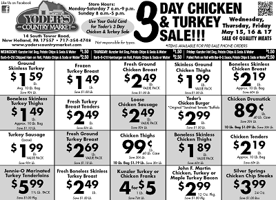 Check out some deals on chicken and turkey at Yoder’s this week only May 15, 16 and 17, 2013!