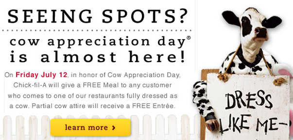 Dress up like a cow and go to Chick-fil-A this Friday, July 12, 2013 to get a FREE meal!