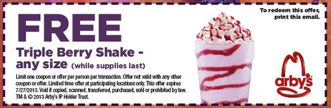 If you are a Arby’s email subscriber, check your email! I got a coupon for a FREE Triple Berry Shake, any size!!!