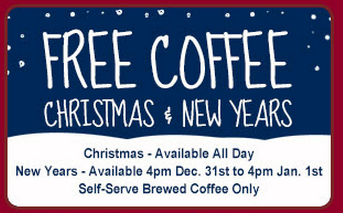 Sheetz is offering FREE coffee on Christmas day and New Year’s day at all locations. Available all day on Christmas, and from 4pm December 31st to 4pm January 1st.