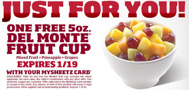 Get a FREE fruit cup at Sheetz with your MySheetz card. Expires 1/19/14.