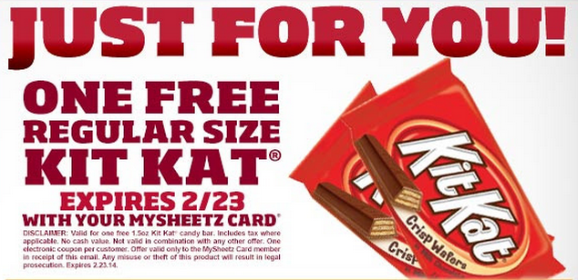 Through February 23, you can use your MySheetz card to get a FREE KitKat bar at any Sheetz location.