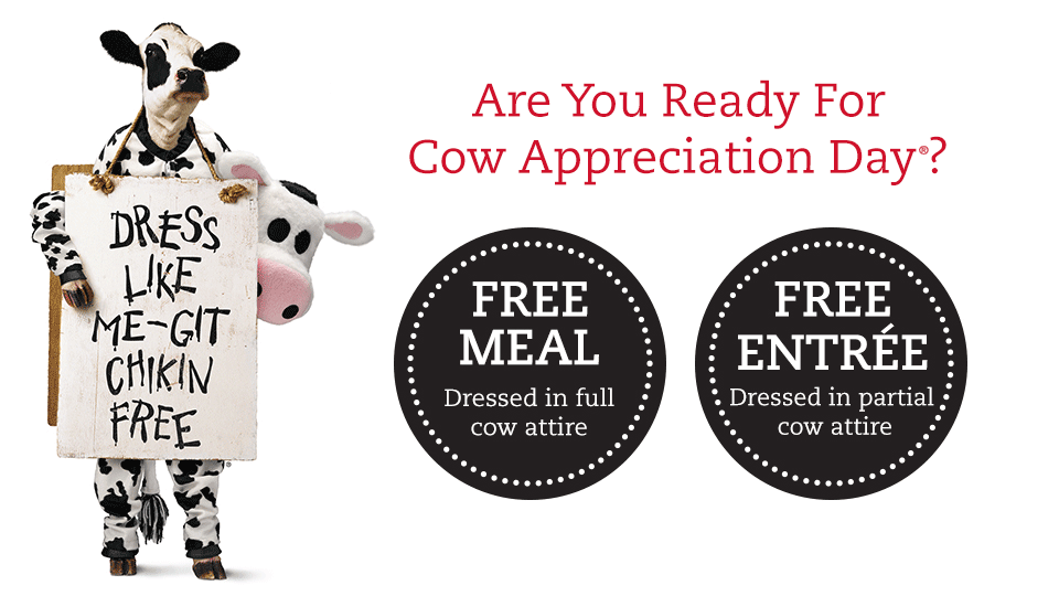 Chick-fil-A’s Cow Appreciation Day is on July 11, 2014. Dress like a cow in full costume and get a FREE meal, or get a FREE entree for being dressed in a partial cow costume.