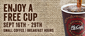 Through September 29, 2014, you can stop by McDonald’s during breakfast hours to get a FREE small McCafe coffee.