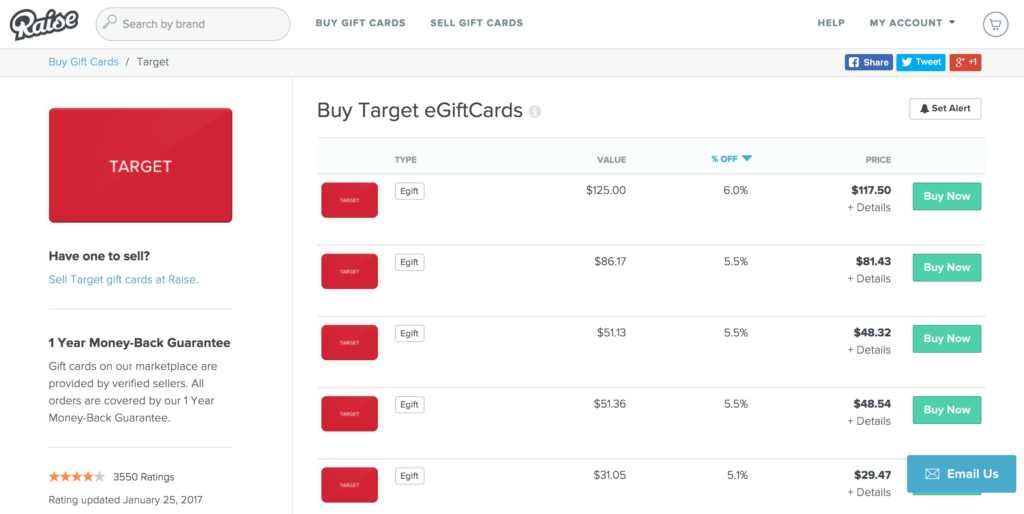 Did you know that places like Raise.com regularly offer up to 6% off Target gift cards? Plus you earn an additional 1% cash back on the purchase of your gift card if you are signed up for Ebates! Thats a better deal than using a Target RedCard, which will save you 5%.