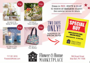 Flower & Craft Warehouse. Hundreds of special deals on Saturday and Monday. Dress in red, white and blue to receive a special coupon at customer service! Located at