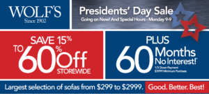 Furniture stores. Furniture stores always seem to have huge President’s Day sales. You’ll find 25% off at Ashley Furniture, two ways to save at Interiors Home in Lancaster, up to 60% off storewide at Wolf Furniture, and you can save up to 50% on recliners and electric fireplaces at Martin’s Furniture.