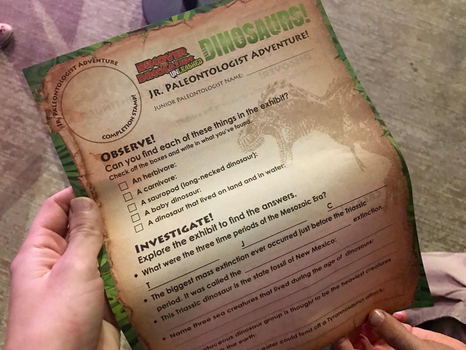 Before attending Dinosaurs UNLEASHED, I had an assumption that it would be more amusement-based. I changed my mind after our visit! As we entered the room, everyone received a scavenger hunt activity sheet with fill in the blanks. If you have younger children, this doesn’t mean much to you, but if you have a child that can read—this was huge!