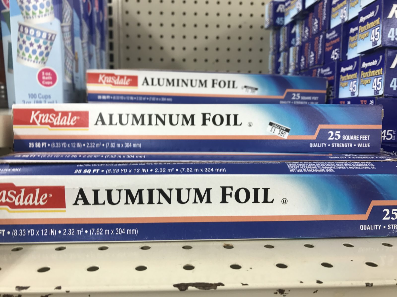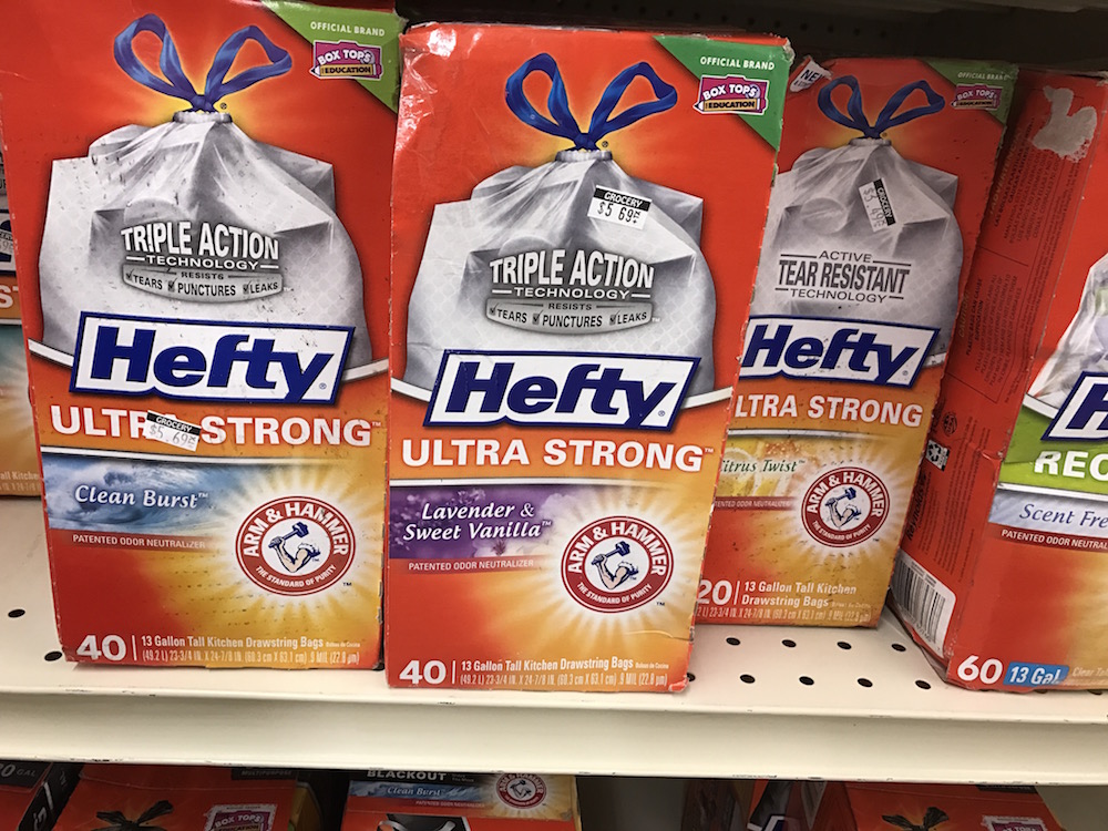 All I could find the day I took these pictures was $5.49 for 40 13-gallon Hefty bags, but usually I look for 60-90 trash bags per box somewhere in the $2.49 to $3.00 range. UPDATE >> I was there this week (9/17) and there were 80ct trash bags for $5.69! So just keep looking and watching, and you’ll find a great deal too!