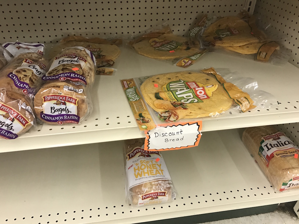 I often find bread and bagels discounted to $.99 or less. I don’t find amazing prices on tortillas usually—I’ll hit up BB’s Discount Grocery for those where they are usually in stock for just $.10.