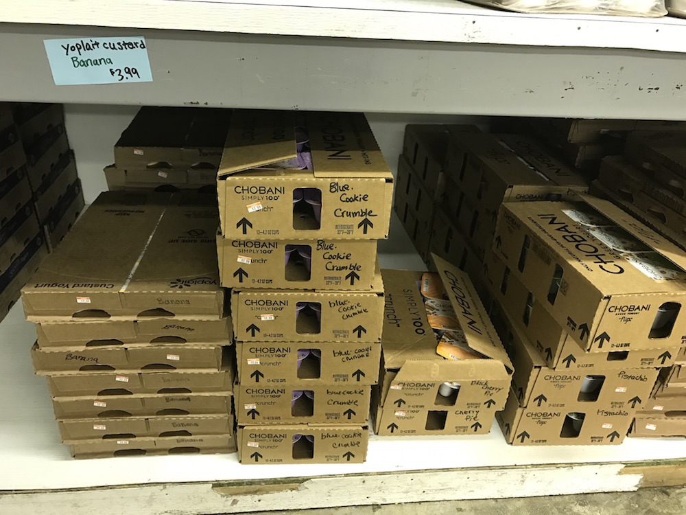 Yogurt is also in the cold room, and there is a wide selection typically. You can buy the Pequea Valley Farms homemade yogurt for just $3.99 (I like to use this for yogurt starter if I’m making my own yogurt), or you’ll find cases of discounted individual size yogurts, perfect for packing lunches. (Sometimes the flavors are unique, but sometimes they are normal!) 🙂