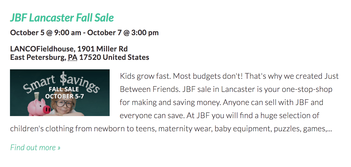 - JBF Lancaster Fall Sale (Friday-Saturday)