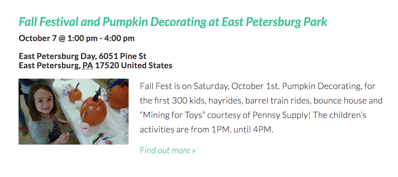 - Fall Festival and Pumpkin Decorating at East Petersburg Park (Saturday)
