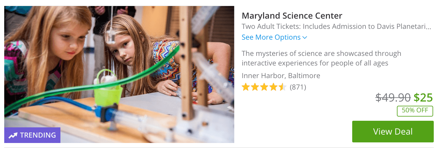- Maryland Science Center. They are offering a Groupon deal right now that includes the Planetarium!! Season Pass tickets are also available at an excellent rate, if you have a science-lover! 🙂